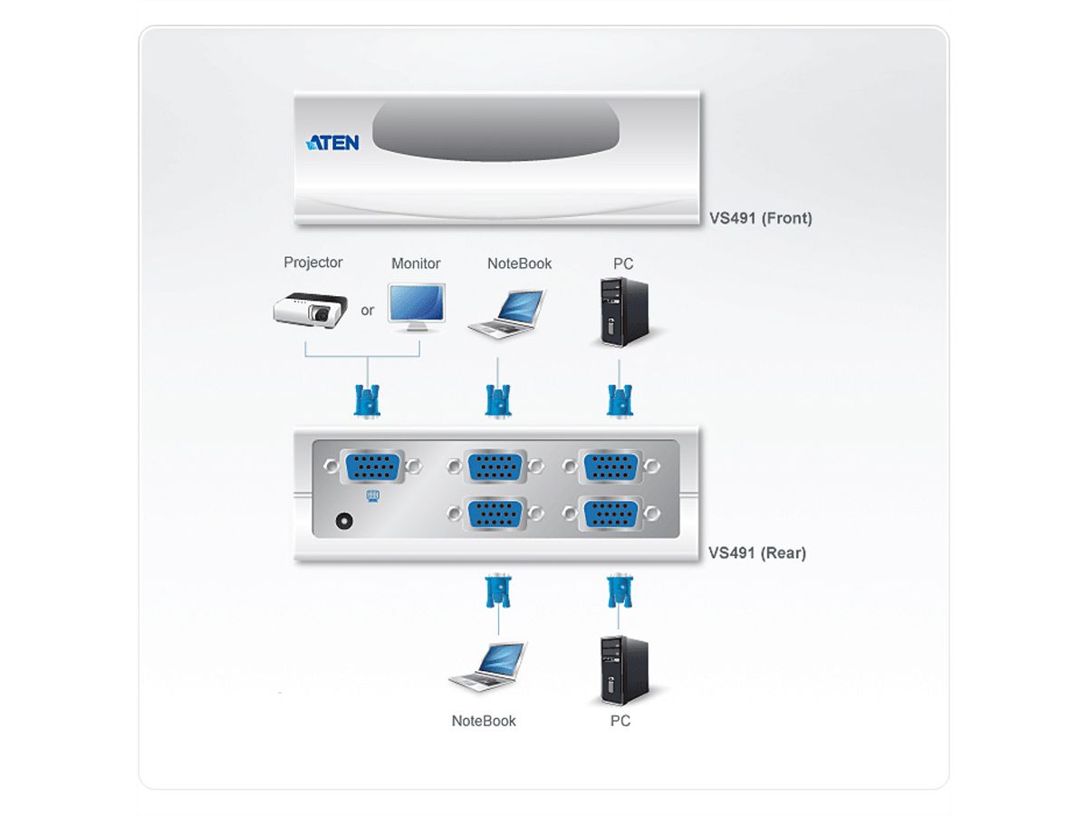 • Anwendungsbeispiel: Teilnehmer einer Konferenz haben ihre Notebooks dabei, um wechselweise Informationen/Bildschirminhalte den anderen über einen Projektor zu präsentieren. Durch den Einsatz des Video-Switch wird das zeitraubende und die Schnittstellen zerstörende Umstecken des Projektor-Kabels vermieden.