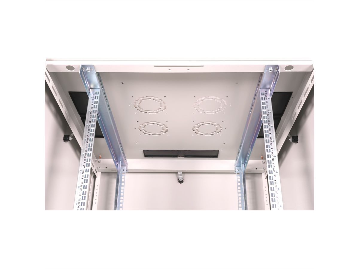 Die Netzwerkschränke der ROLINE Basic Serie wurden entwickelt, um einen einfachen und besonders kosteneffizienten Netzwerkausbau zu ermöglichen. Durch strategisch platzierte Kabeleinlässe ist eine mühelose Installation je nach Anwendungsfall gewährleistet. Im Bodenchassis befindet sich der Kabeleinlass, der durch eine verschraubte Abdeckplatte geschützt und im hinteren mittigen Bereich positioniert ist. Bei Schränken ab 800 mm Breite werden zusätzliche Kabeleinlässe mit Kunststoffabdeckung links und rechts hinzugefügt. Diese sind auch im Dach integriert (einmal bei 600 mm Schrankbreite, dreimal bei 800 mm Schrankbreite). Für die Installation eines Lüftermoduls ist das Dachchassis ebenfalls mit einem ausgestanzten Bereich versehen. Die Lüftereinheit kann nur von innen installiert und deinstalliert werden. Im Inneren sind zwei Paar galvanisierte 19"-Profilschienen verbaut, die in beide Richtungen ablesbar sind und sich in der Tiefe verstellen lassen. Sie sind zudem mit zusätzlichen Tiefenstreben im Schrank verbunden. Jeder Schrank besteht aus einer robusten Stahlkonstruktion mit einer Materialstärke von bis zu 1,5 mm Stahlblech.