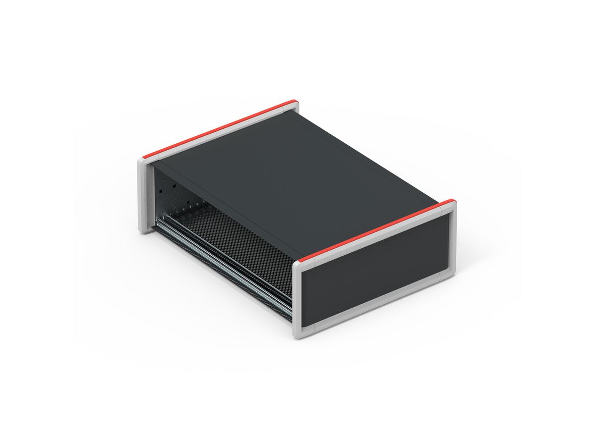 Hochwertiger Schutz für Ihre elektronischen Komponenten in modularen 19"-Desktop-Gehäusen RatiopacPRO Style. Heben Sie die Identität Ihrer Marke mit anpassbaren Designoptionen hervor. Desktopgehäuse mit Schutzrahmendesign und Gummistreifen oben und unten für einen sicheren Stand und mit integrierter Stapelfunktion. Gehäuse für 19"-Komponenten (Führungsschienen) oder proprietäre Komponenten (Montageplatte). Für die Etablierung einer EMV-Schirmung, müssen dem Gehäuse zusätzliche Komponenten hinzugefügt werden. Front- und Rückseite für die Frontplattenmontage mit Halsschrauben und Nippel vorbereitet