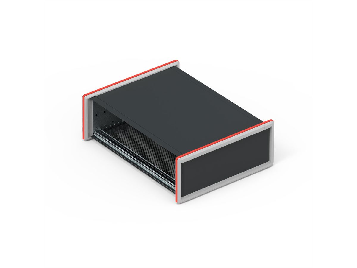Hochwertiger Schutz für Ihre elektronischen Komponenten in modularen 19"-Desktop-Gehäusen RatiopacPRO Style. Heben Sie die Identität Ihrer Marke mit anpassbaren Designoptionen hervor. Desktopgehäuse mit Schutzrahmendesign und Gummistreifen rund um den Rahmen, für noch mehr Schutz. Gehäuse für 19"-Komponenten (Führungsschienen) oder proprietäre Komponenten (Montageplatte). Für die Etablierung einer EMV-Schirmung, müssen dem Gehäuse zusätzliche Komponenten hinzugefügt werden. Vorderseite für Frontplattenmontage ohne Schrauben und Rückseite für Standard-Frontplattenmontage vorbereitet