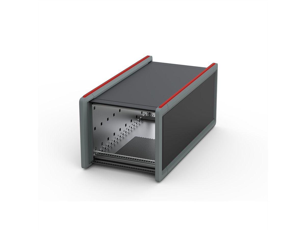 Hochwertiger Schutz für Ihre elektronischen Komponenten in modularen 19"-Desktop-Gehäusen RatiopacPRO Style. Heben Sie die Identität Ihrer Marke mit anpassbaren Designoptionen hervor. Desktopgehäuse mit Schutzrahmendesign und Gummistreifen oben und unten für einen sicheren Stand und mit integrierter Stapelfunktion. Gehäuse für 19"-Komponenten (Führungsschienen) oder proprietäre Komponenten (Montageplatte). Für die Etablierung einer EMV-Schirmung, müssen dem Gehäuse zusätzliche Komponenten hinzugefügt werden. Front- und Rückseite für die Frontplattenmontage mit Halsschrauben und Nippel vorbereitet