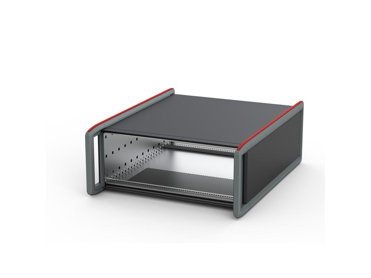 Hochwertiger Schutz für Ihre elektronischen Komponenten in modularen 19"-Desktop-Gehäusen RatiopacPRO Style. Heben Sie die Identität Ihrer Marke mit anpassbaren Designoptionen hervor. Desktopgehäuse mit Schutzrahmendesign und Frontgriffen für einfache Handhabung. Rückseite mit zirkulierendem Gummistreifen zum Schutz des Gehäuses während des Transports. Gehäuse für 19"-Komponenten (Führungsschienen) oder proprietäre Komponenten (Montageplatte). Für die Etablierung einer EMV-Schirmung, müssen dem Gehäuse zusätzliche Komponenten hinzugefügt werden. Vorderseite für Frontplattenmontage ohne Schrauben und Rückseite für Standard-Frontplattenmontage vorbereitet