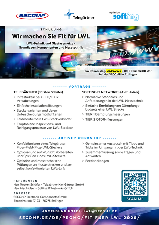 Sichern Sie sich jetzt Ihren Platz bei unserer Schulung „Fit für LWL“ und vertiefen Sie Ihr Wissen rund um moderne Glasfaser-Infrastrukturen. Gemeinsam mit unseren Partnern TELEGÄRTNER und SOFTING vermitteln wir praxisnahes Know-how zu LWL-Technik, Komponenten und Messtechnik. Freuen Sie sich auf spannende Fachvorträge, praktische Workshops – vom Konfektionieren von Steckern bis zu optischen Messungen – sowie wertvolle Tipps direkt aus der Praxis.