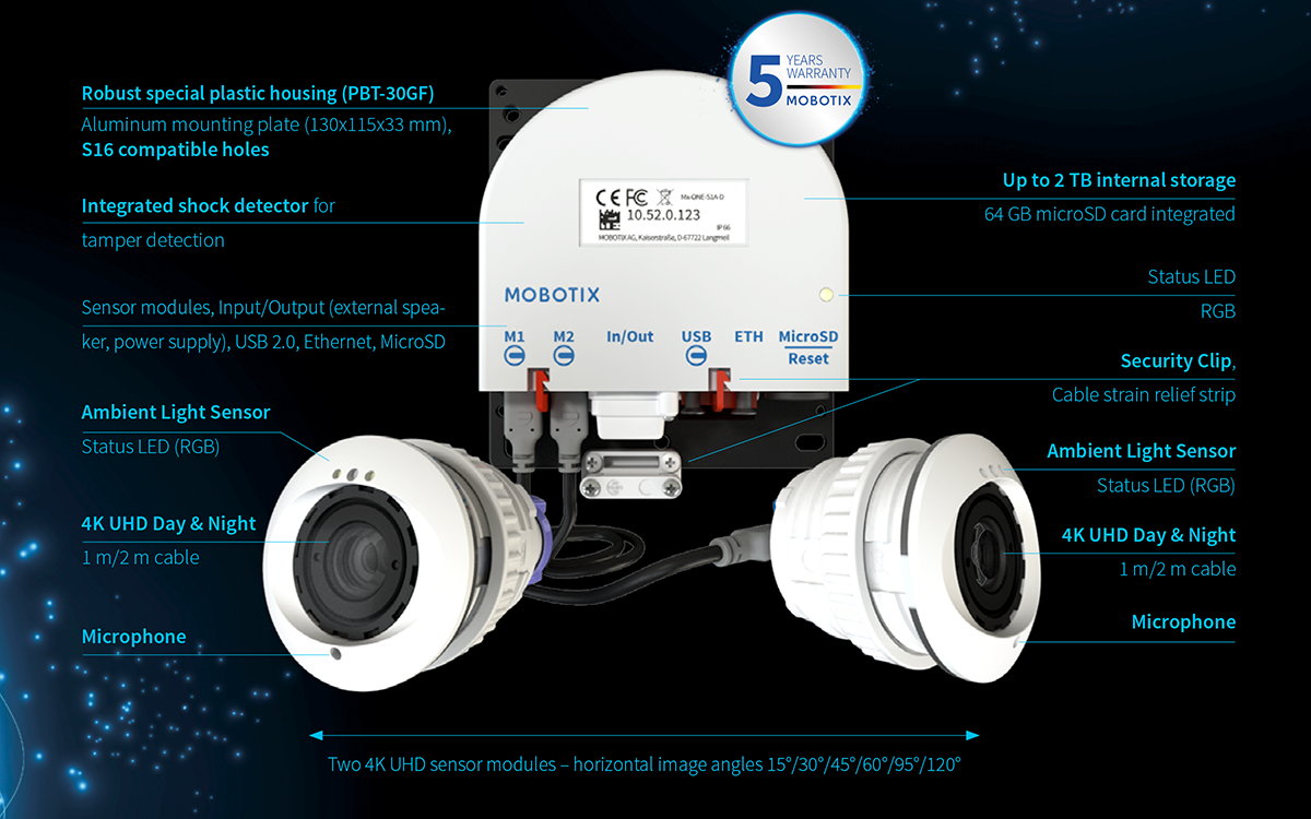 Die MOBOTIX S-ONE Dual folgt dem bewährten Prinzip der Trennung von Kamerabody und Sensormodulen. Der eigentliche Kamerakern kann geschützt in Decken, Wänden oder technischen Gehäusen installiert werden, während lediglich die Sensormodule sichtbar bleiben.